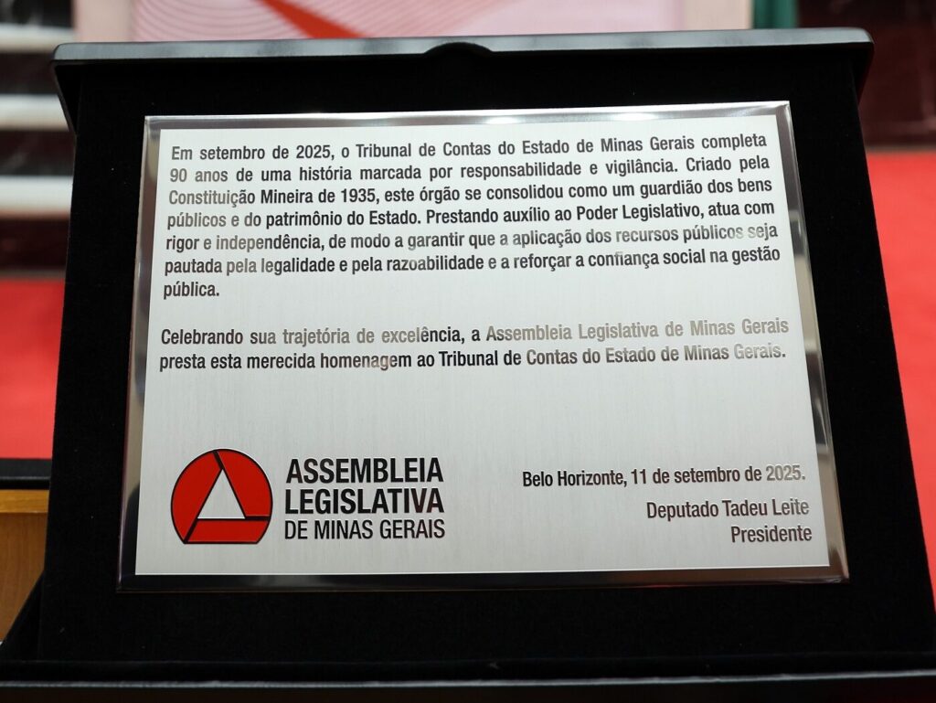 Durante a cerimônia, o Presidente da Assembleia Legislativa, Deputado Tadeu Leite, entregou ao Presidente do TCE-MG, Conselheiro Durval Ângelo, uma placa alusiva à data comemorativa, em que se destacou o papel histórico e constitucional da instituição como guardiã do patrimônio público e dos interesses coletivos, reconhecendo sua atuação marcada pela responsabilidade, vigilância e compromisso com a legalidade.