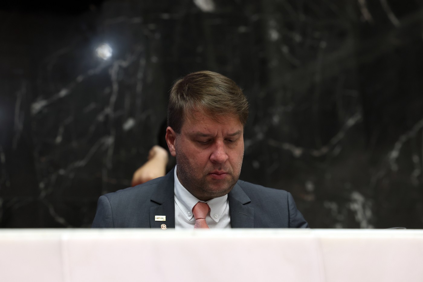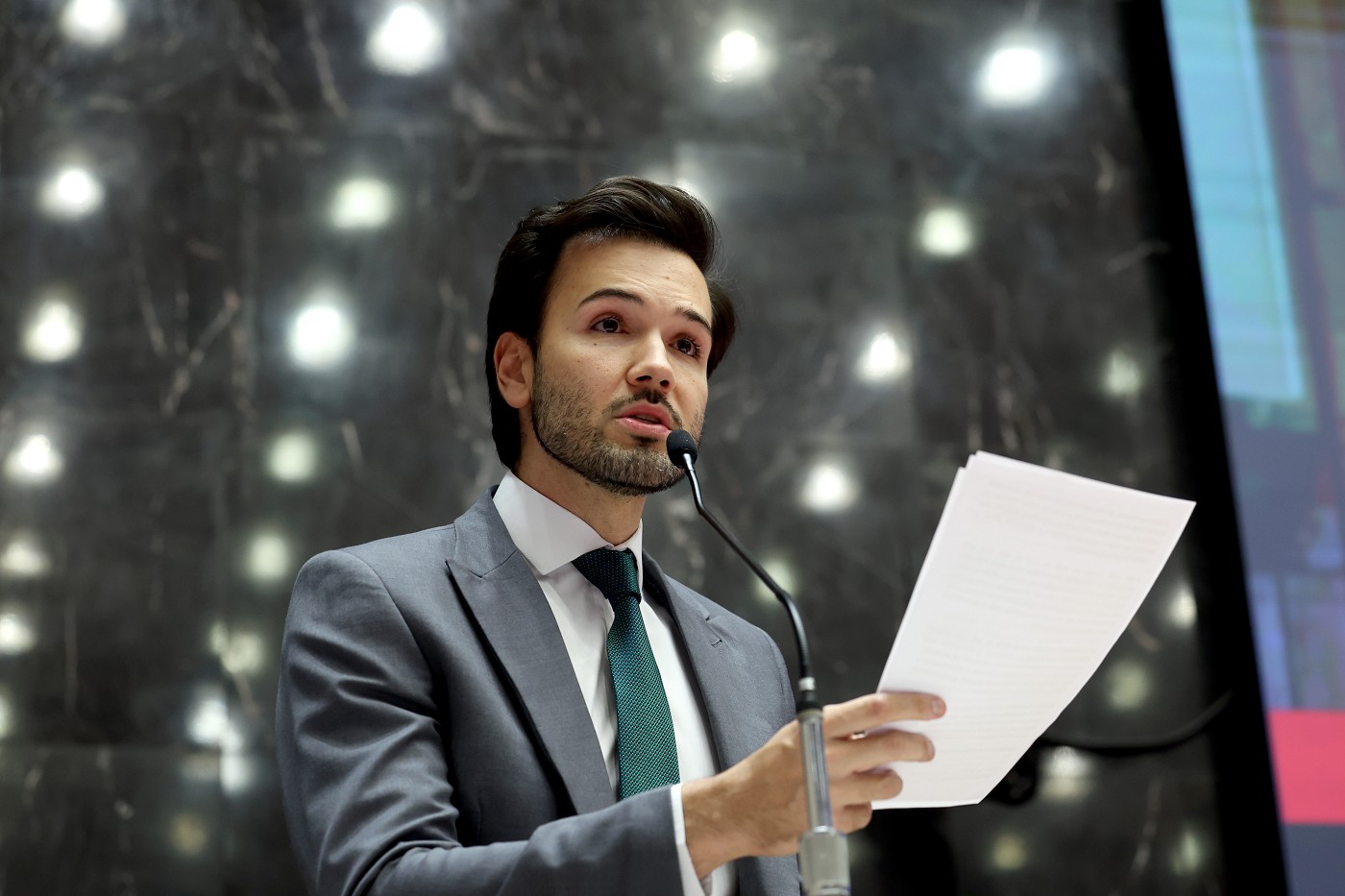 O Deputado Estadual e Presidente da ALMG, Tadeu Leite, durante seu discurso. Foto: Elizabete Guimarães | ALMG